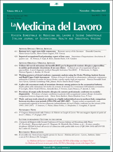 «A clinical case of occupational allergy to piperacilline. A novel diagnostic method: Basophil Activation Test (BAT)». Background: Piperacillin, unlike other antibiotics, rarely causes immediate allergic reactions. Only two cases related to occupational exposure are reported in the literature. Objectives: Adoption of new methods for diagnosis of occupational allergy to drugs. Methods: An atopic nurse, aged 30 years, was referred to our hospital for an allergic work-related reaction to piperacillin. The patient had suffered two successive episodes with immediate cutaneous reaction, angioedema and dyspnoea after preparing piperacillin. Almost four years previously she had suffered from similar symptoms after taking amoxicillin. She was submitted to a clinical examination and a routine allergic test, performing also specific IgE (Phadia Pharmacia ImmunoCap) and BAT (Basophil Activation Test) for Beta-lactam antibiotics. Results: A positive response to piperacillin was observed in our case using BAT, a new non- invasive and safe method, that proved useful for diagnosis of allergy. Moreover, we observed a change from an allergic reaction for therapeutic use of amoxicillin to a work-related adverse reaction to another beta-lactam, piperacillin. Conclusions: In previous clinical cases cutaneous and specific challenge tests were performed for diagnosis. At present, availability of an in vitro test, such as BAT, may provide new diagnostic opportunities, and a useful tool for studying clinical cases other than, in perspective, monitoring exposed workers. Preventive measures were taken in the workplace to lower the risk of sensitization and allergic response. The nurse was transferred to a well controlled job.